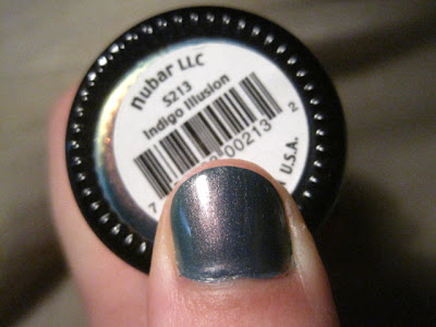 here's another awesome oldie from nubar called 'indigo illusion' and it's a really cool blue/silver/green ish colour. it's so gorgeous! i love the green flash and the complex blue! i dont' really have words to describe it, i just adore it. i can't remember why i haven't worn it sooner!!!!